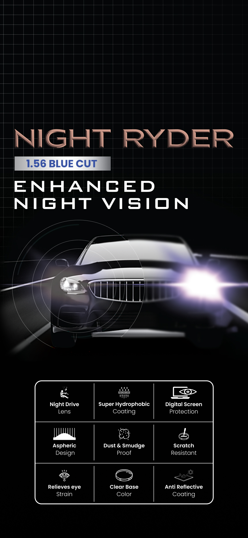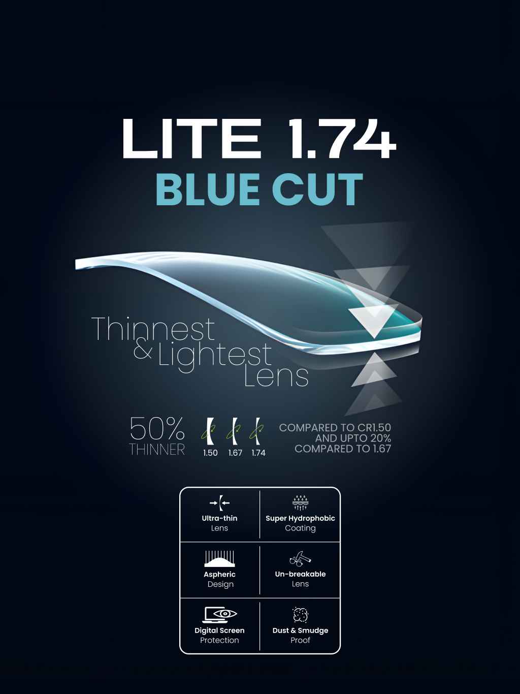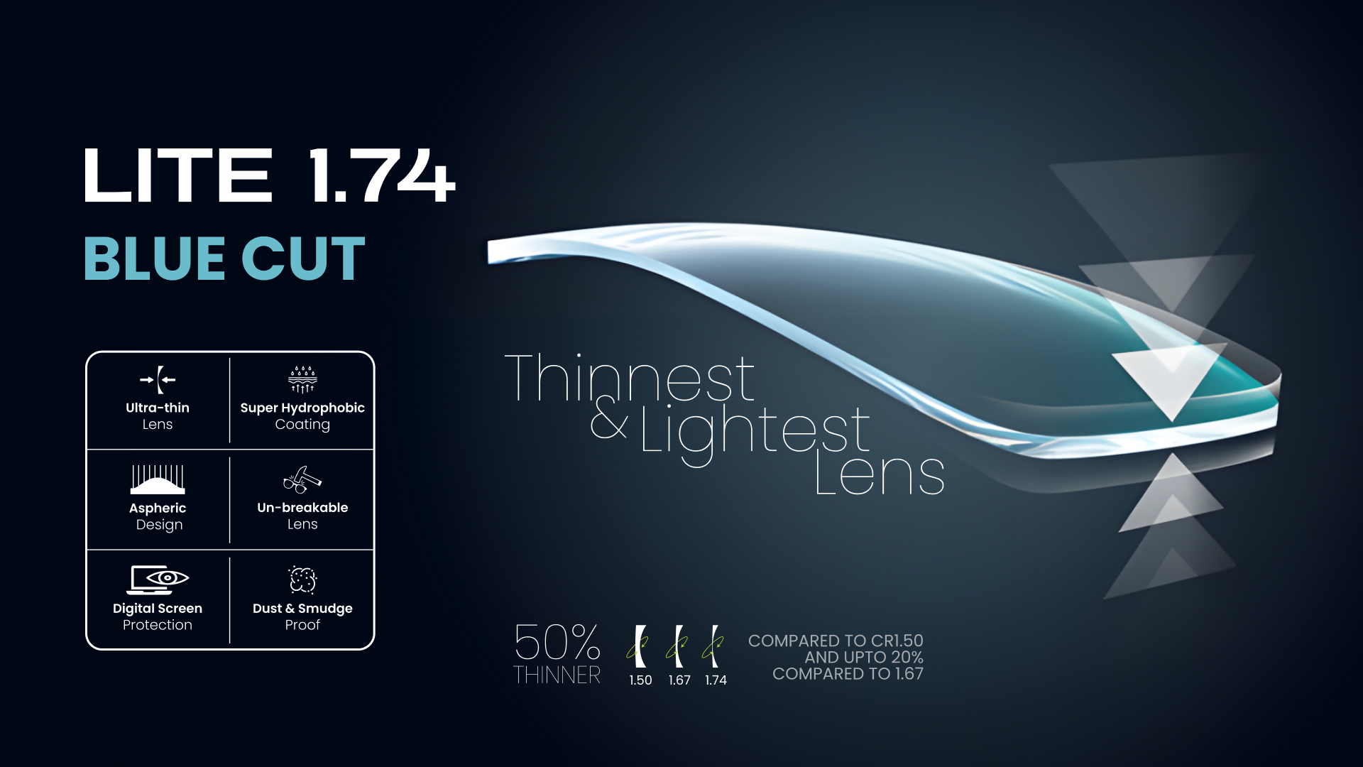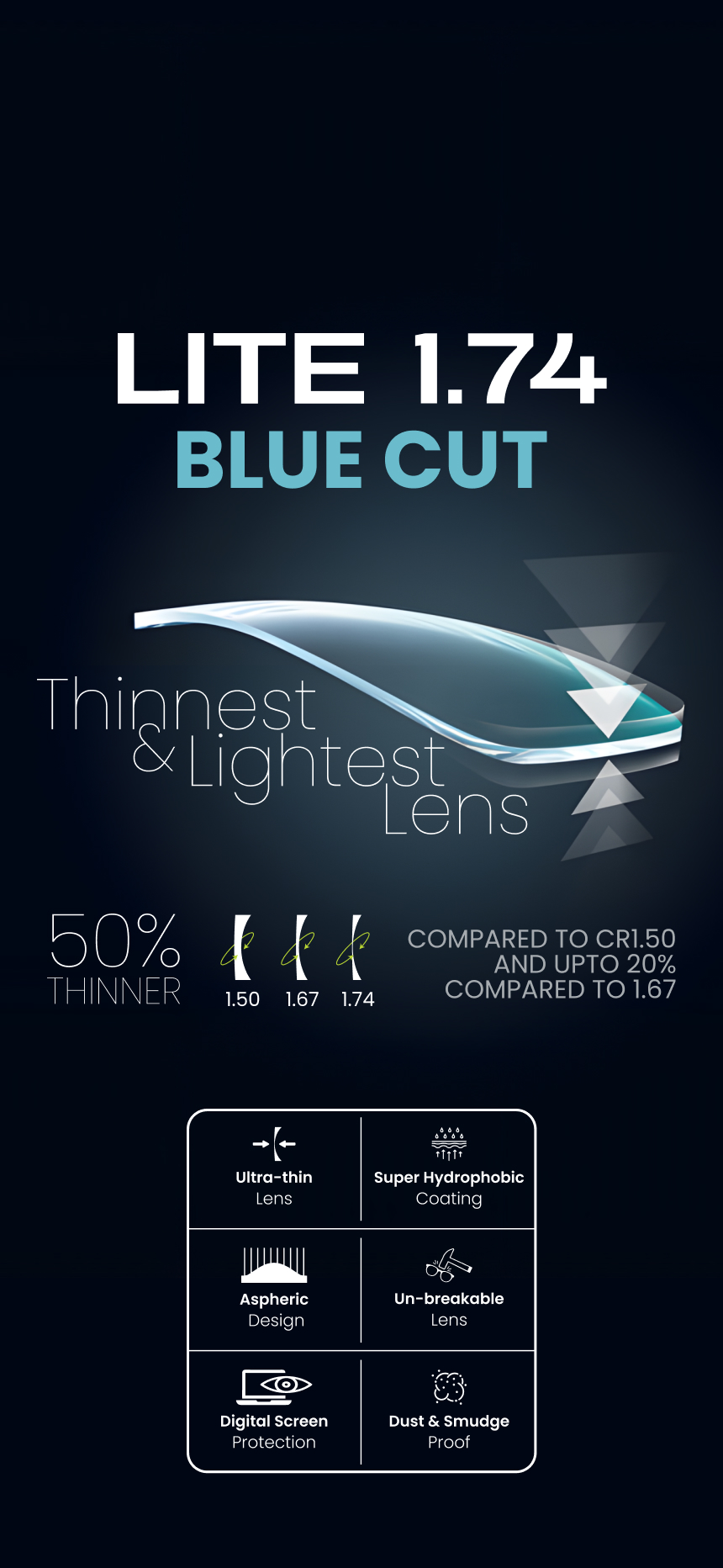 They have an aspheric design and 75mm dia which makes them upto 40% thinner and flatter as compared to normal lenses. Also, the lenses have super hydrophobic coating i.e. dust and smudge proof. These lenses provide protection from harmful UV Rays and have a clear base colour.